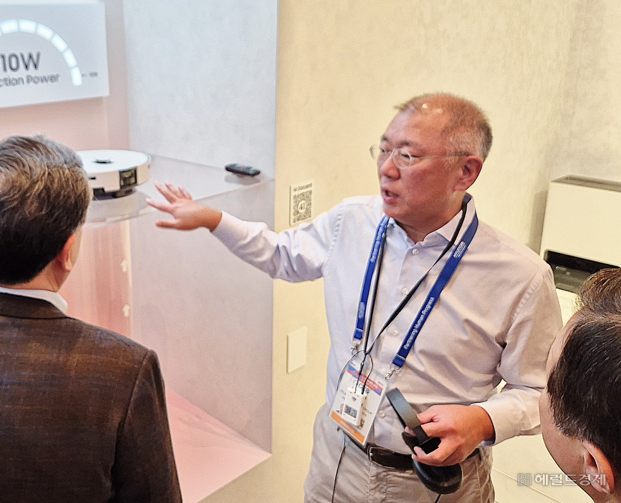 이어 정 회장은 ‘비스포크 AI 스팀’ 로봇청소기 앞에선 로봇청소기의 주행능력과 흡입력에 대해 장재훈 부회장과 긴 시간 얘기를 나눴다. 특히, 정 회장은 노 대표에게 로봇청소기의 바퀴 성능을 언급하고 “저희랑 한 번 콜라보 하시죠”라며 직접 현장에서 협력을 제안하기도 했다.