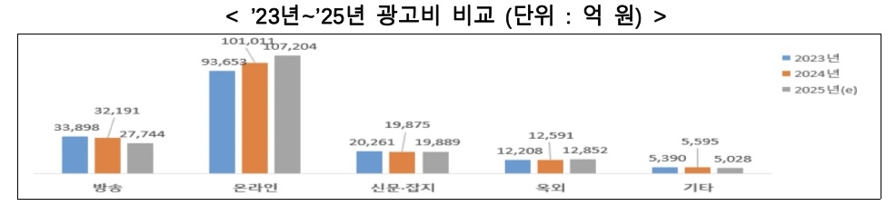 이날 함께 발표된 ‘2025년 방송통신광고비 조사’ 결과에서는 온라인 광고가 증가하고, 방송 광고가 감소하는 추세가 지속되고 있는 것으로 나타났다.