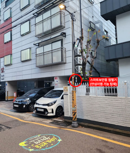 | 건물 옆 갓길에 보안등이 설치되어 있는 사진이다.빨간색 원 안으로 스마트보안등 점멸기, 안심이앱 가능 탑재라는 텍스트가 보인다. |