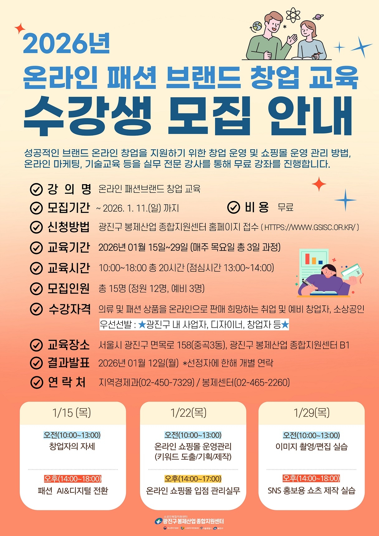 모집 인원은 총 15명(정원 12명, 예비 3명)이다. 1월 11일까지 광진구 봉제산업종합지원센터 누리집에서 신청하면 된다. 서류 심사를 거쳐 교육생을 선발하며, 광진구 내 사업자, 디자이너, 창업자 등은 우선 선발 대상이다. 선정 결과는 1월 12일에 개별 안내할 예정이다. 자세한 사항은 광진구 지역경제과 또는 광진구 봉제산업종합지원센터로 문의하면 된다.