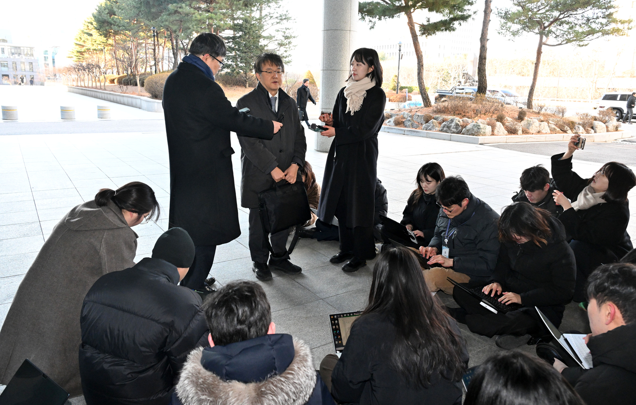 | 통일교·신천지 등 종교단체의 정치 개입 및 유착 의혹 수사를 이끌 김태훈 정교유착 비리 합동수사본부장(서울남부지검장)이 합수본 사무실이 마련된 서울 서초구 서울고검 사무실에 출근하며 취재진 질문에 답변하고 있다. 임세준 기자 |
