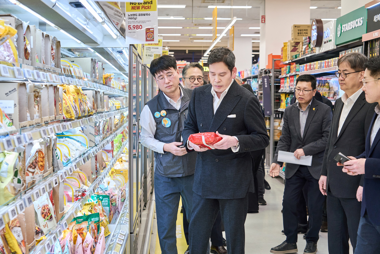 정 회장은 이날 직접 장을 보기도 했다. 참다랑어뱃살회와 노브랜드 가정간편식, 냉동식품, 라면 3종 등이다. 그는 동행한 임직원들에게 “다들 뭐 하나씩 사서 가라”고 권하기도 했다.
