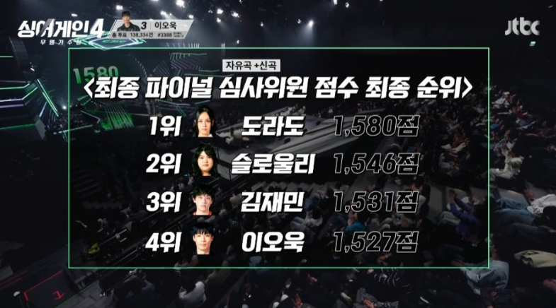 그럼에도 심사위원 점수 4위인 이오욱인 심사위원 점수 1위인 도라도를 2위로 내려오게 하고 최종 우승했다. 실시간 문자 및 온라인 투표가 40%, 심사위원 점수가 30%를 차지했기 때문이다.