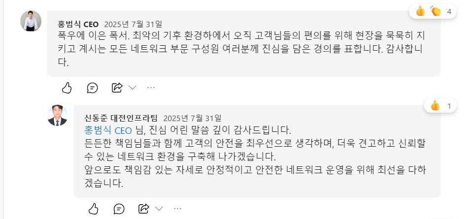 한편, 홍범식 사장도 트리고에서 적극적으로 활동하며 구성원들과 직접 소통하고 있다. 홍 사장은 지난해 네트워크 장애 복구 현장에 대해 언급하며 “어렵고 힘든 일에 자원해주신 구성원 여러분들의 너무나도 따뜻한 스토리에 행복하게 한 주를 마무리한다”는 댓글을 달고 구성원들을 격려했다.