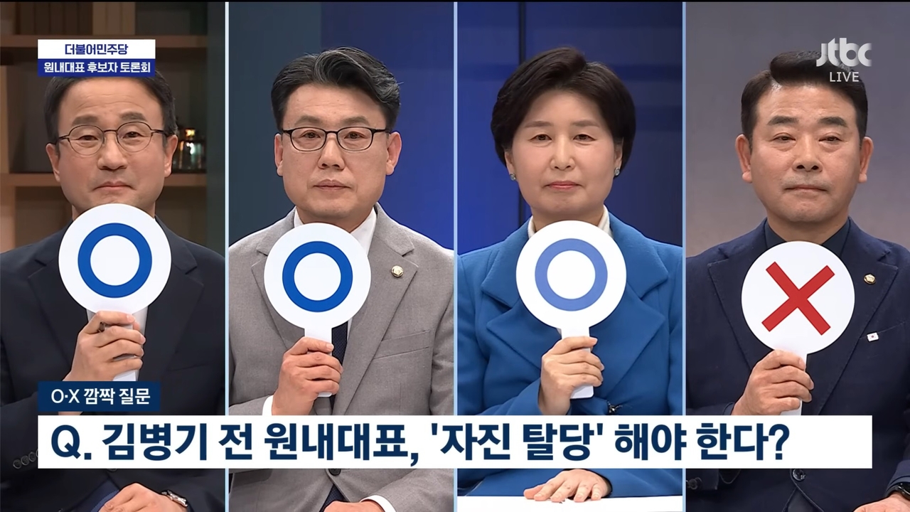 이날 오후 서울 마포구 JTBC 스튜디오에서 생방송으로 진행된 합동토론회에서 한병도·진성준·백혜련 후보는 ‘김 전 원내대표가 자진 탈당해야 하느냐’는 질문에 ‘O’를, 박정 후보는 ‘X’를 선택했다.