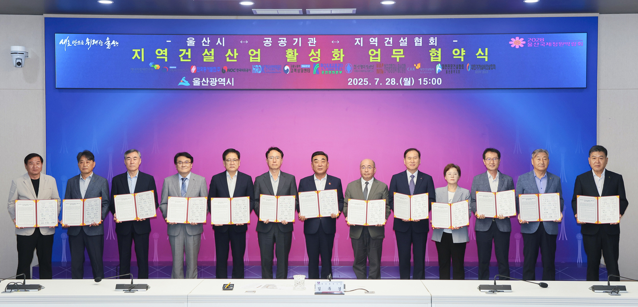 | 울산시와 울산에 본사를 둔 에너지경제연구원 등 9개 공공기관과 대한건설협회 울산광역시회 등 모두 12개 기관이 지역 건설산업 활성화를 위해 지난해 7월 28일 업무협약을 체결했다. [울산시 제공] |