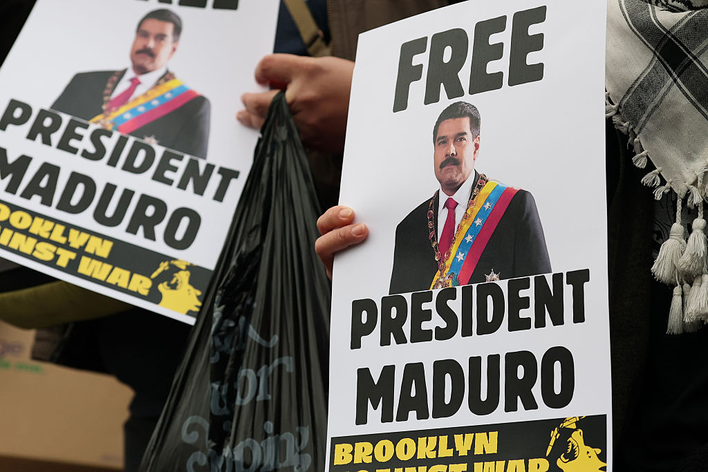 | 지난 5일(현지시간) 미국 뉴욕 연방법원 앞에서 니콜라스 마두로 베네수엘라 대통령 지지자들이 마두로 부부의 석방을 요구하는 피켓을 들고 시위하고 있다.[게티이미지] |