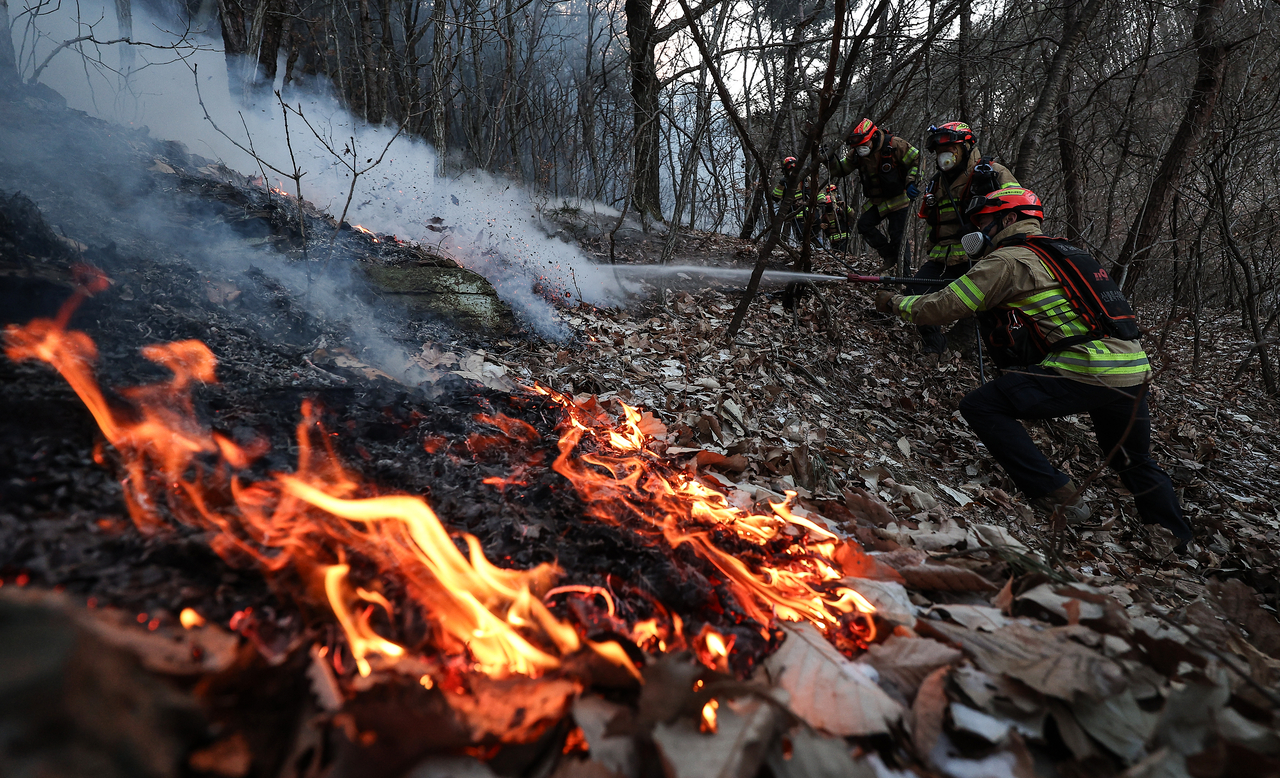 | 11일 경북 의성군 한 야산에서 경북도 119산불특수대응단이 전날 발생한 산불의 잔불 정리를 하고 있다. [연합] |
