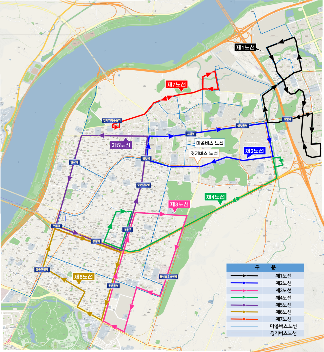 7개의 비상수송버스 임시노선은 ▲고덕리엔파크1단지-고덕강일2지구-고덕강일3지구-강일역을 거치는 1노선 ▲동부기술교육원-고덕역-상일동역-고덕자이-한영외고-명일역을 거치는 2노선 ▲강동농협(호국영웅보훈회관)-중앙보훈병원역-올림픽파크포레온-둔촌동역-길동역을 거치는 3노선 ▲삼성E&A-길동생태공원-강동역-길동역을 거치는 4노선 ▲명일초교-암사역-천호역-강동역-길동역-굽은다리역-명일역을 거치는 5노선 ▲오륜교회-강동구청역-천호역-강동역-둔촌동역을 거치는 6노선 ▲암사역사공원역-고덕비즈밸리를 거치는 7노선으로, 10분 내외의 간격으로 운행할 예정이다.