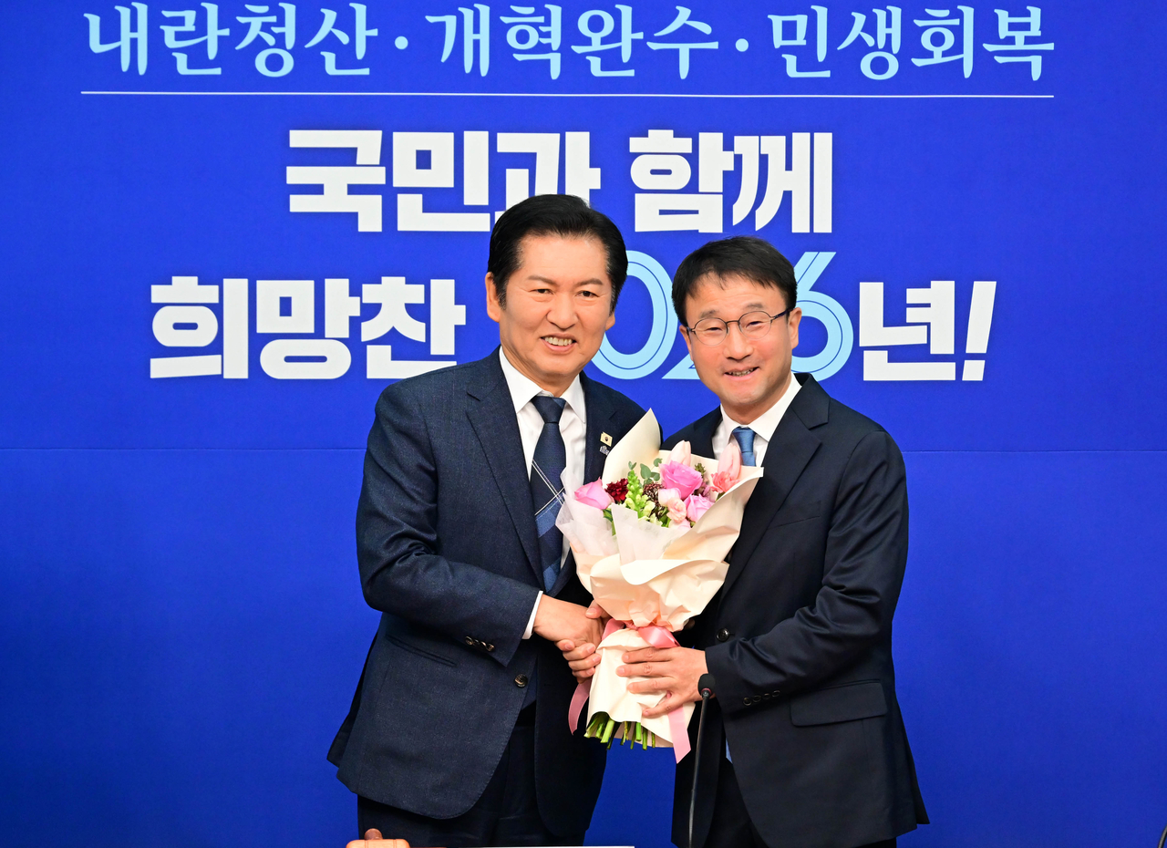 | 정청래(왼쪽) 더불어민주당 대표가 12일 오전 서울 여의도 국회에서 열린 최고위원회의에서 한병도 신임 원내대표에게 꽃다발을 전달하고 기념촬영을 하고 있다. 이상섭 기자 |