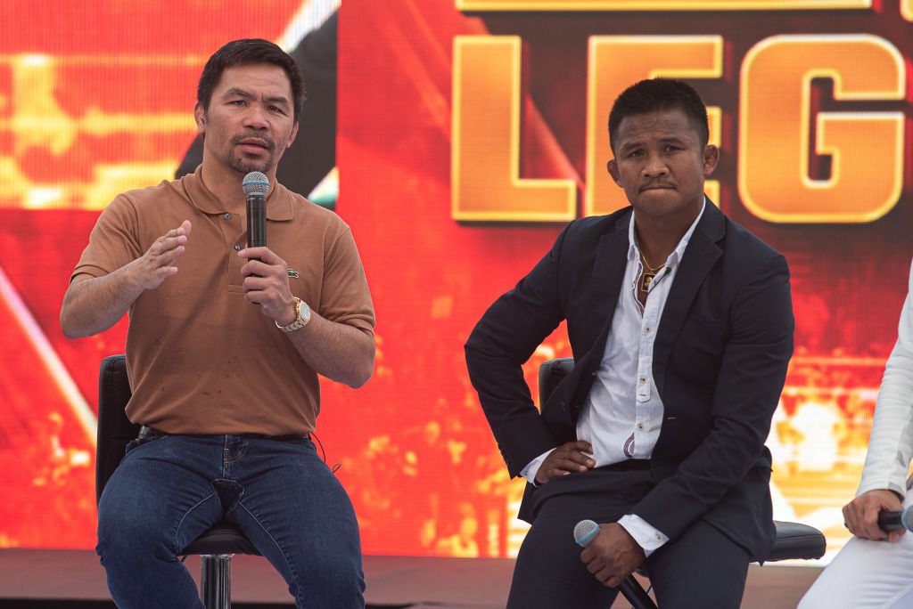 | 지난 2023년 복싱 8체급 석권의 전설 매니 파퀴아오(필리핀, 왼쪽)와 시범경기로 대결한 ‘무에타이 전설’ 부아카우 반차멕이 나란히 인터뷰에 응하고 있다. [게티이미지] |