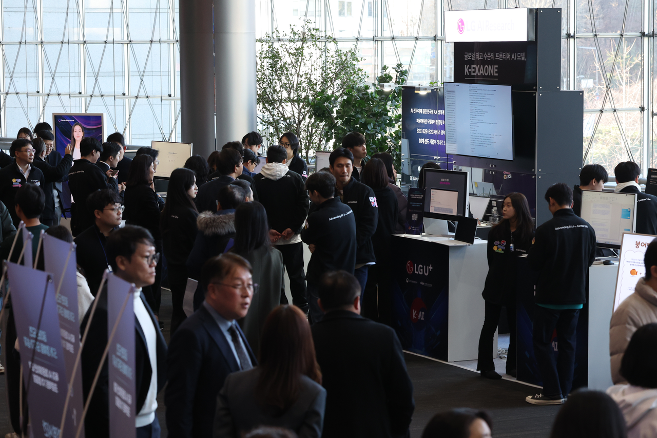 | 지난달 30일 서울 강남구 코엑스에서 열린 ‘독자 AI 파운데이션 모델’ 프로젝트 1차 발표회에서 참석자들이 LG AI연구원 부스를 체험하는 모습 [연합] |