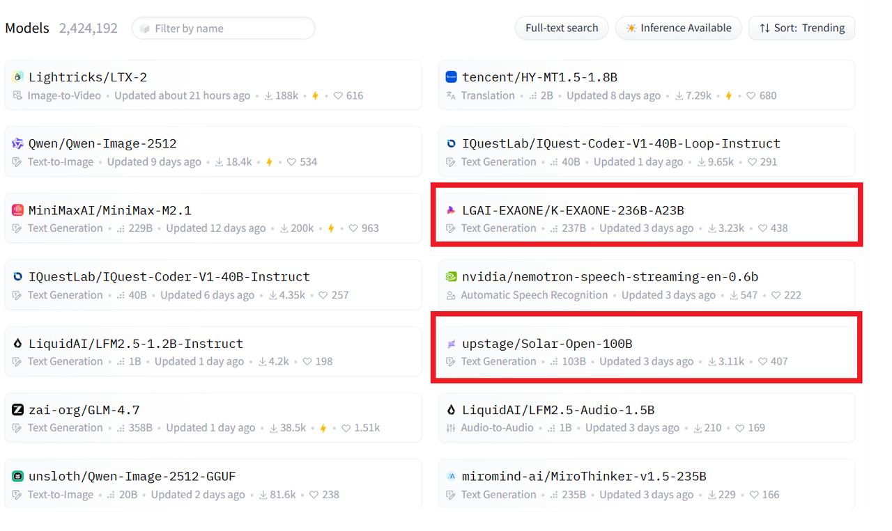| 9일 오후 2시 기준 LG AI연구원 ‘엑사원 236B-A23’, 업스테이지 ‘솔라 오픈 160B’가 허깅페이스 트렌딩 모델 순위권에 오른 모습 [허깅페이스 캡처] |