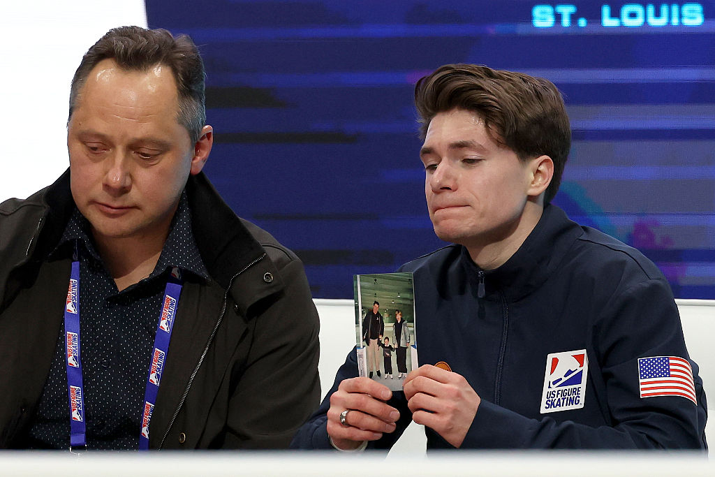 | 지난 8일(현지시간) 미 미조리주 세인트루이스 엔터프라이즈센터에서 열린 2026 전미피겨선수권대회에서 쇼트프로그램을 연기한 막심 나우모프가 부모와 찍은 옛 사진을 든 채 판정 결과를 기다리고 있다. [게티이미지] |