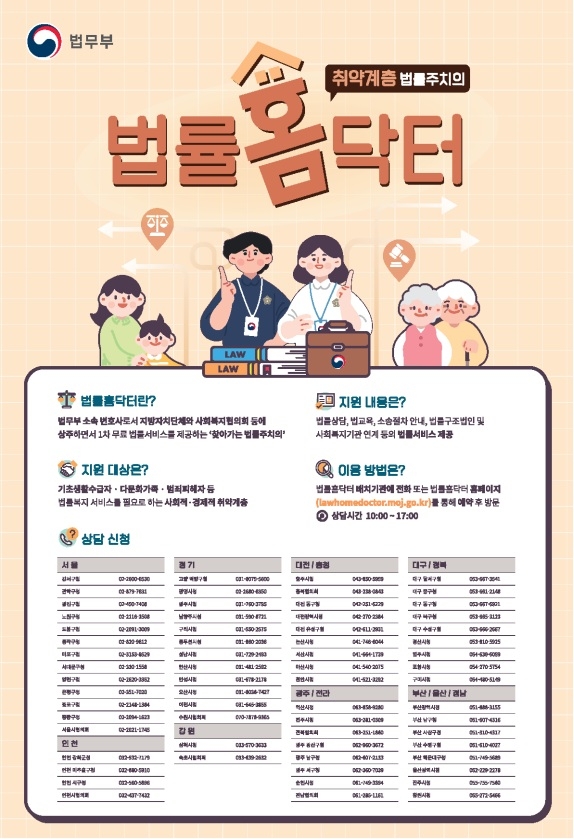 ‘법률홈닥터’는 사회적·경제적 취약계층에게 1차 무료 법률서비스를 제공하는 사업이다. 1차 법률서비스에는 법률상담, 법교육, 법률문서 작성 조력, 유관기관 연계 등을 포함하며, 소송구조, 소송수행은 제외한다.