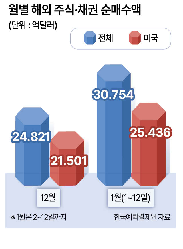 13일 한국예탁결제원 증권정보포털(SEIbro)에 따르면 2일부터 12일까지 국내 개인 투자자의 해외 주식·채권 순투자 규모는 30억7542만달러(약 4조5101억원)에 달했다. 이 중 미국 주식에만 25억4358만달러(3조6795억원)가 유입됐다. 지난해 연말 세제 요인과 환율 부담으로 감소했던 해외투자는 연초 들어 다시 확대되는 중이다. 12월 해외 주식 및 채권 순매수액은 24억8213달러였지만, 이미 1월 들어 이를 훌쩍 뛰어넘은 상태다.