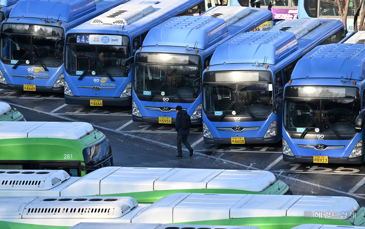 [헤럴드pic] 운행 멈춘 서울 버스 글꼴 선택 본문 텍스트 크게본문 텍스트 작게 인쇄 [헤럴드경제=임세준 기자] 서울 시내버스 노동조합이 전면파업에 돌입한 13일 오전 서울 도심 내 공영차고지에 운행을 중단한 버스가 주차되어 있다.