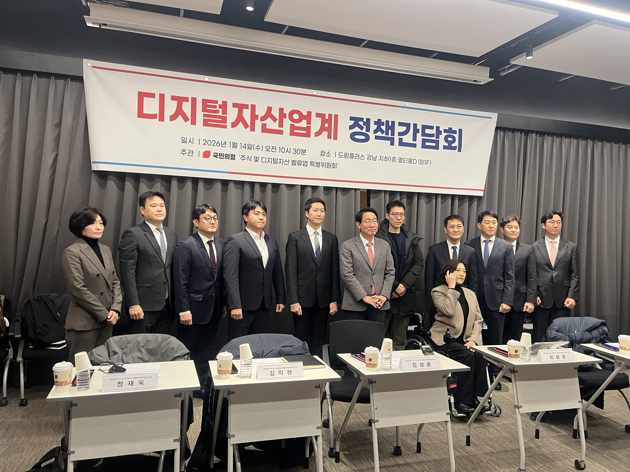 | 국민의힘 주식 및 디지털자산 밸류업 특별위원회가 14일 서울 강남에서 ‘디지털자업계 정책간담회를 진행했다. (왼쪽부터) 김재진 닥사(DAXA) 상임부회장, 정재욱·김익현 특별위원회 위원, 김영진 빗썸 부사장, 차명훈 코인원 대표, 김상훈 특별위원장, 서창훈 토스 사업개발이사, 최보윤 국민의힘 의원, 문성억 특별위원회 위원, 오경석 두나무 대표, 신원근 카카오페이 대표, 오세진 닥사 의장 [사진=유동현 기자] |