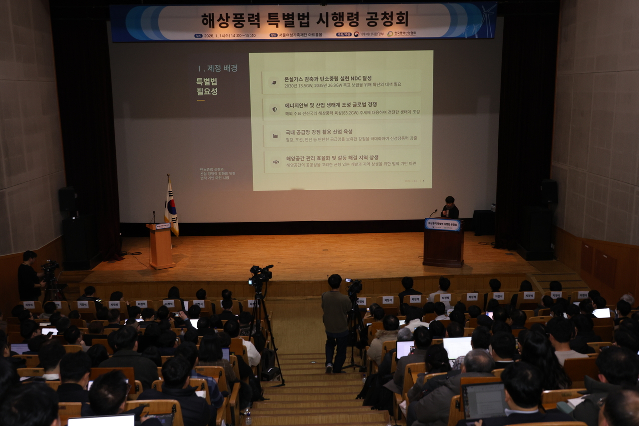 기후환경에너지부는 14일 서울 여성가족재단 아트홀봄에서 한국풍력산업협회와 함께 주최한 ‘해상풍력 특별법 시행령 공청회’에서 이같이 밝혔다. 이날 행사는 오는 19일까지 입법예고 중인 ‘해상풍력 보급 촉진 및 산업 육성에 관한 특별법(이하 해풍법) 시행령 제정령안’ 시행 2개월을 앞두고 진행됐다.