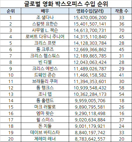 [헤럴드경제=문영규 기자] 영화 ‘아바타’ 시리즈로 흥행 열차에 올라탄 할리우드 영화배우 조 샐다나가 ‘역사상 누적 흥행 수입이 가장 많은 주연배우’ 자리에 올랐다.