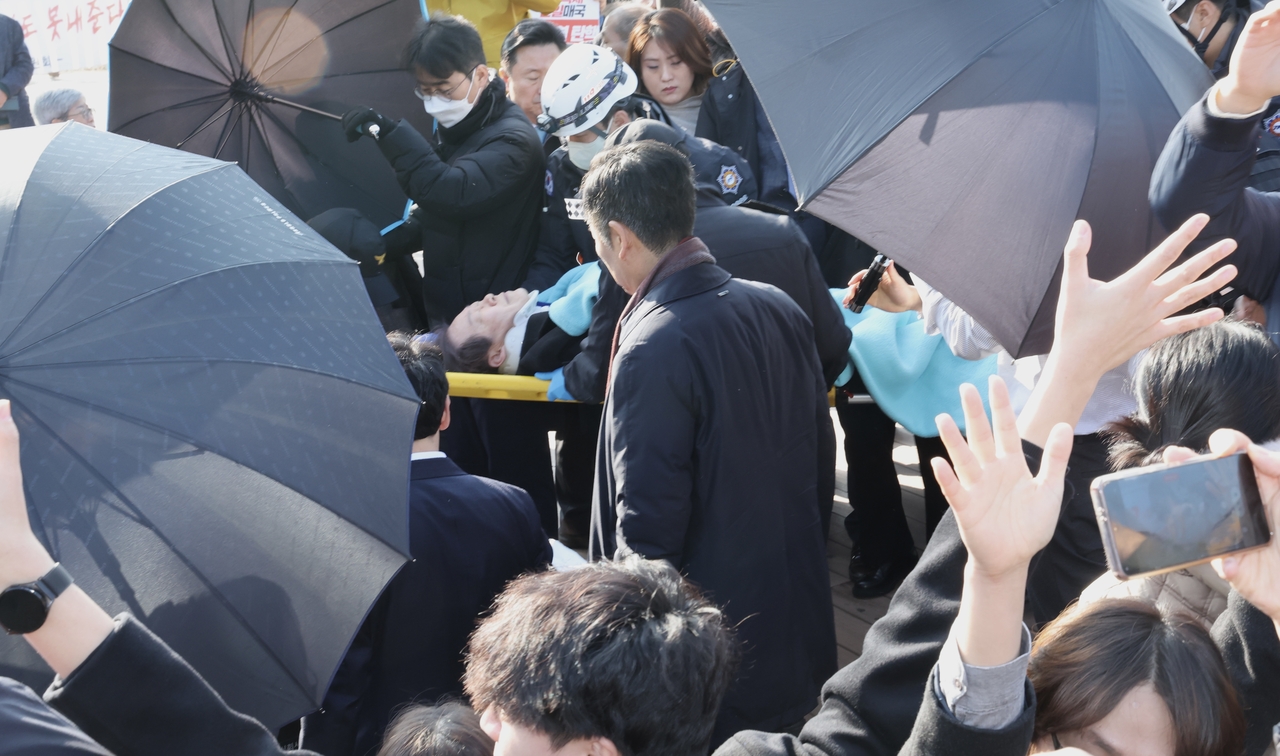 | 이재명 더불어민주당 대표가 2024년 1월 2일 부산 가덕도 대항전망대에서 차량으로 이동하는 과정에서 흉기를 든 괴한에게 목 부위를 흉기로 습격받았다. [부산일보 제공] |
