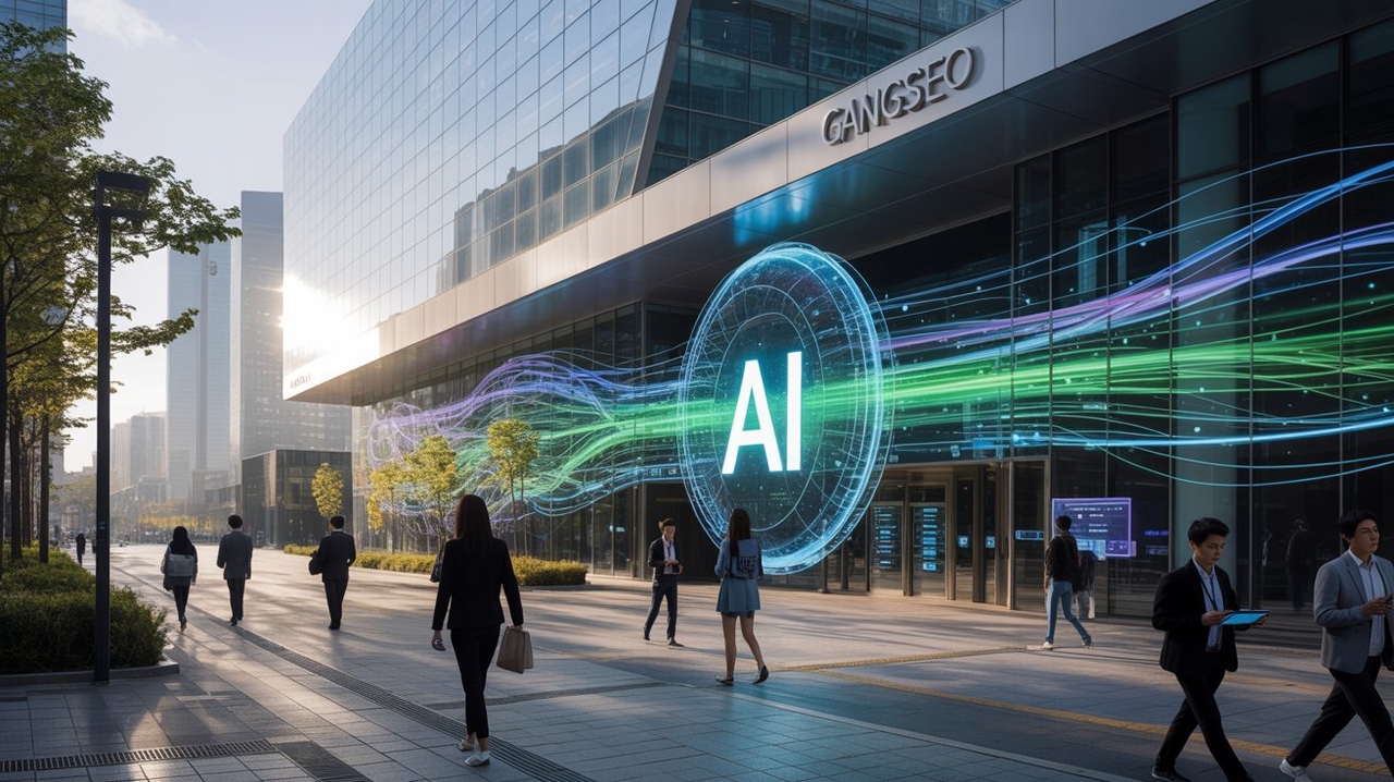 | ‘강서’라고 적힌 건물 외관과 AI 글자가 보이는 사진이다. AI 글자 주변으로 빛이 퍼져 나가는 듯한 효과가 나타나 있다. |