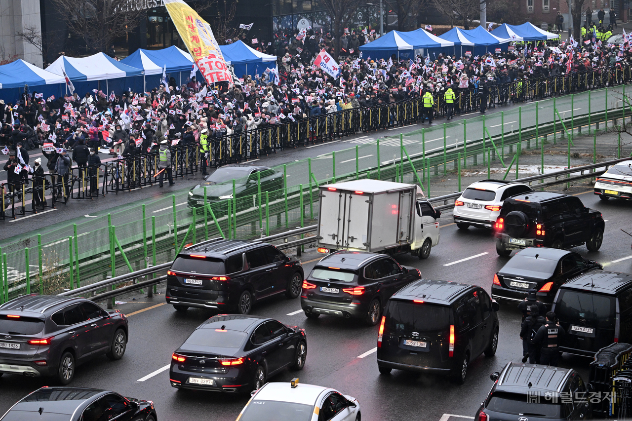 | 윤석열 대통령의 체포영장 유효기간 만료일이었던 지난해 1월 6일 오전 서울 용산구 한남동 대통령 관저 인근에서 윤 대통령 지지자들이 집회를 하고 있다. 임세준 기자 |