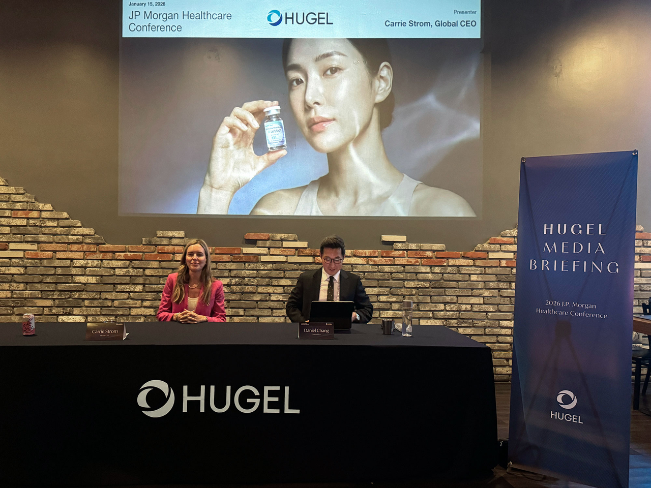 | 캐리 스트롬 휴젤 글로벌 CEO(왼쪽)과 장두현 휴젤 한국 CEO가 14일(현지시간) 미국 샌프란시스코에서 ‘JP모건 헬스케어 콘퍼런스’ 참가를 계기로 기자간담회를 개최했다. [휴젤 제공] |