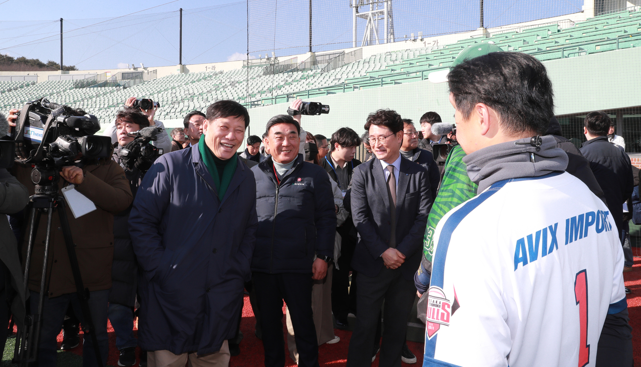 | 울산웨일즈가 선수 선발을 위한 공개기량평가를 가진 지난 13일 허구연 KBO 총재(왼쪽에서 첫 번째)와 김두겸 울산시장(두 번째)이 울산 문수야구장을 방문했다. [울산시 제공] |