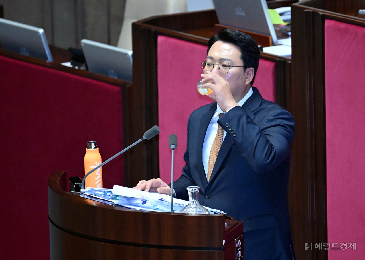 [헤럴드pic] 물 마시는 천하람 개혁신당 원내대표 글꼴 선택 본문 텍스트 크게본문 텍스트 작게 인쇄 [헤럴드경제=이상섭 기자] 천하람 개혁신당 원내대표가 15일 국회에서 열린 본회의에서 ‘윤석열ㆍ김건희에 의한 내란ㆍ외환 및 국정농단 행위의 진상규명을 위한 특별검사 임명 등에 관한 법률안’에 대해 무제한 토론(필리버스터)을 하던 중 물을 마시고 있다.