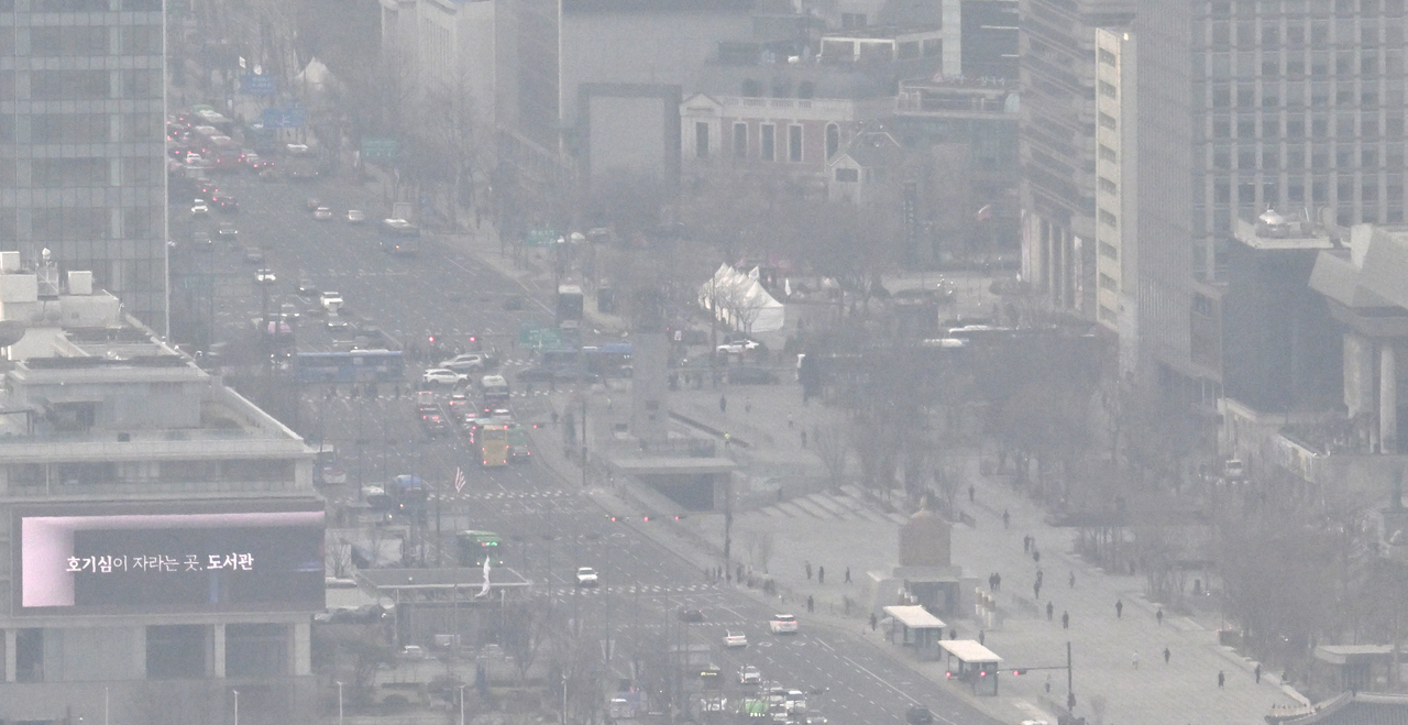 | 서울 종로구 북악스카이웨이에서 바라본 광화문광장 일대가 미세먼지로 인해 뿌연 모습을 나타내고 있다. 임세준 기자 |