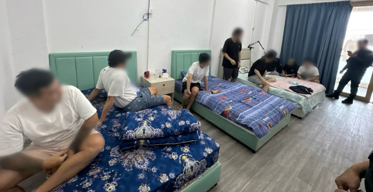 | 서울동부지방검찰청 보이스피싱범죄 합동수사부의 캄보디아 노쇼 사기 조직 검거 장면. 조직원들을 숙소에서 검거한 직후 모습. [검찰 제공] |