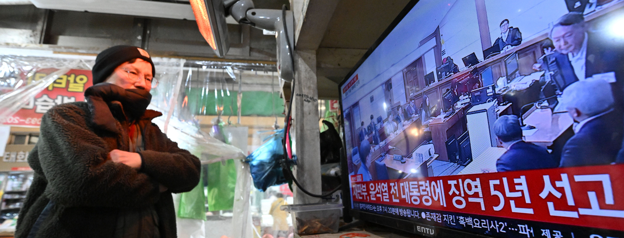 | 16일 오후 서울 서대문구 인왕시장 내 점포에서 상인이 윤석열 전 대통령의 체포방해 등 혐의 사건에 대한 1심 선고 중계방송을 시청하고 있다. 임세준 기자 |
