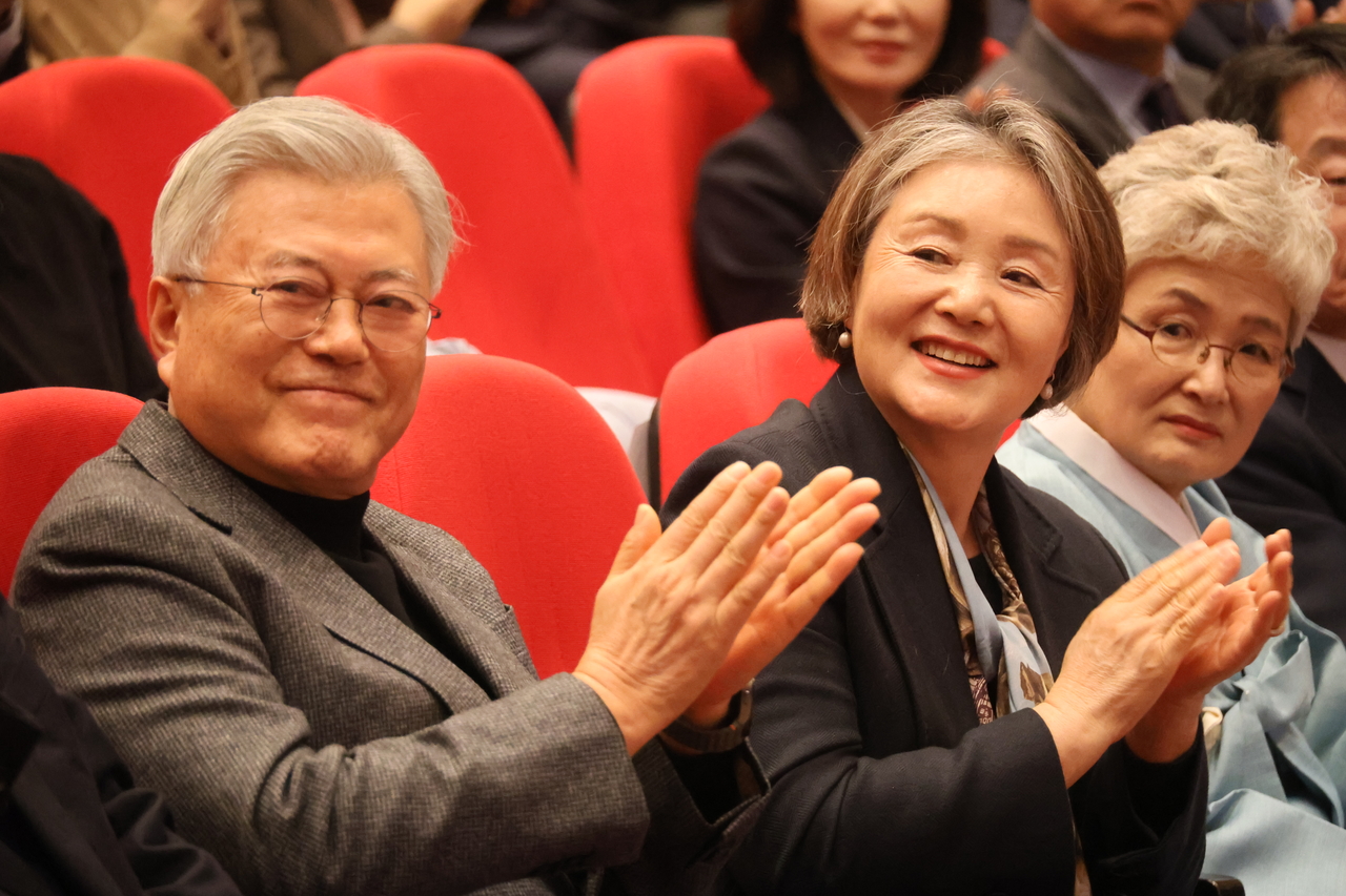 | 문재인 전 대통령 내외가 17일 대전 서구 배재대 21세기관에서 열린 김한수 전 배재대 부총장의 ‘교실을 교실답게’ 출판기념회에 참석해 손뼉을 치고 있다. [연합] |