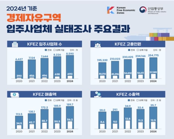 또 2024년 말 기준 경제자유구역 입주 사업체 실태를 조사한 결과 입주 기업이 총 8590개로 전년보다 4.4% 증가했다. 2017년~2024년 기간 동안 입주사업체 연평균 증가율은 7.3%였다.
