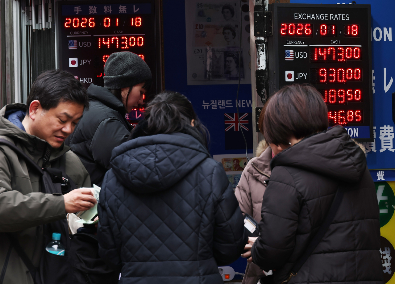 | 원·달러 환율이 1.500원을 넘보는 가운데, 주요 시중은행들도 본격적으로 환율 상승(원화 가치 하락) 방어에 나섰다. 정부·한국은행 등과 잇따라 대책을 논의하고, 개인·기업이 지나치게 예금 등의 형태로 달러를 쌓아놓지 않고 팔아 원화로 바꾸도록 유도하기 시작했다. 사진은 18일 서울 명동의 환전소 밀집지역. [연합] |