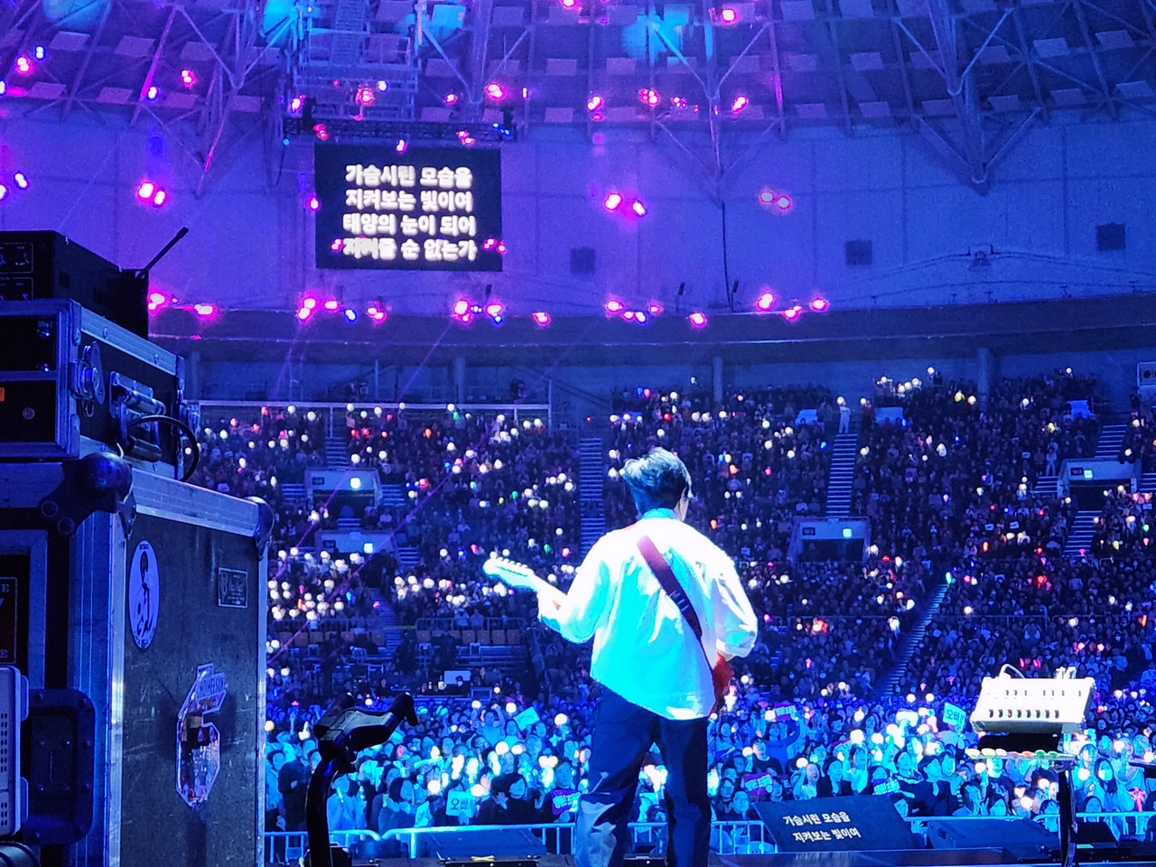 고(故) 안성기 출연의 영화 ‘실미도’를 뮤직비디오로 쓴 록 오페라 ‘태양의 눈’이 시작되면 객석의 온도는 달라진다. 태양처럼 새빨간 기타를 멘 그가 중저음의 기름진 톤으로 쏟아내는 아찔한 멜로디는 가왕의 또 다른 목소리다. 기타 솔로와 함께 클라이맥스로 내달리면 객석의 도파민은 한도 초과로 치솟는다.