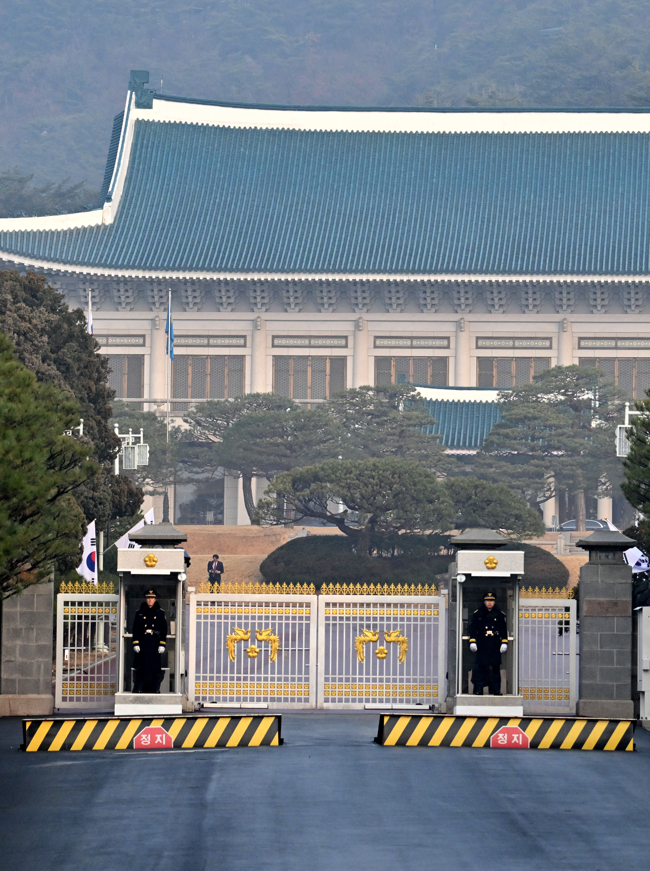 | 이재명 대통령이 청와대로 첫 출근한 지난달 29일 오전 서울 종로구 청와대 정문에서 경호처 관계자들이 경비를 서고 있다. 임세준 기자 |