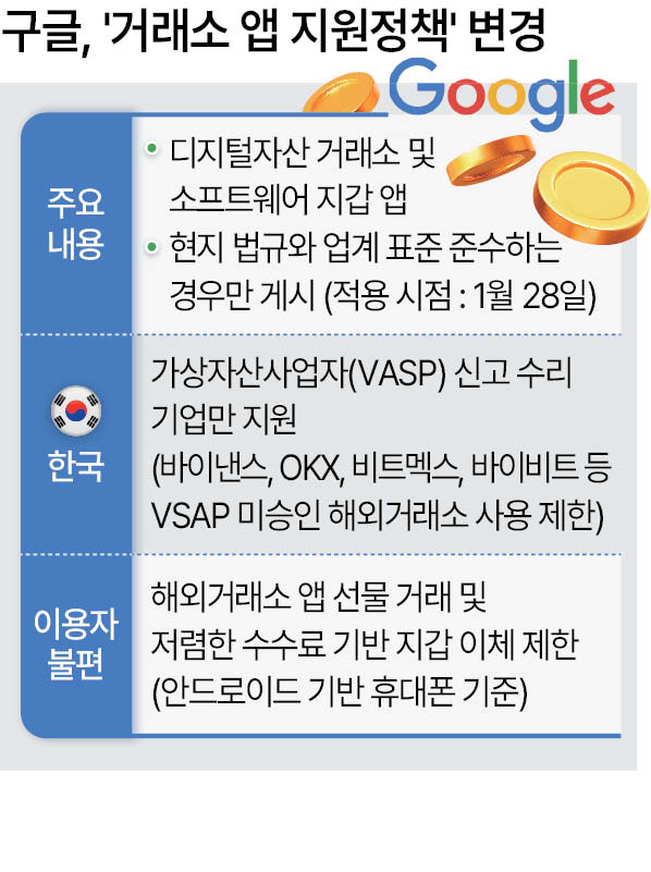 한국에서는 가상자산사업자(VASP)로 등록되지 않은 바이낸스·오케이엑스(OKX) 등 해외 거래소 앱 위주로 제약이 발생할 것으로 보인다. 무엇보다 국내 안드로이드폰 이용자들은 해외 거래소에서 선물거래와 낮은 수수료 혜택 등에 불가피하게 제약을 받게 될 것으로 예상된다.
