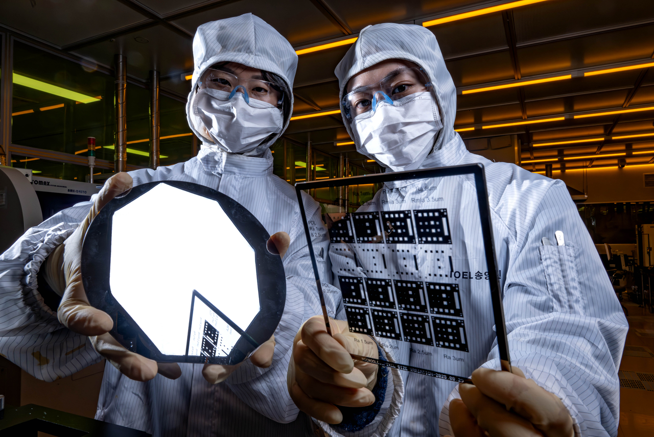 | 대전광역시 유성구 한국과학기술원(KAIST)에서 전기 및 전자공학부 학생들이 반도체 회로 기판 생산에 사용되는 반도체 웨이퍼와 포토마스크를 살펴보고 있다. [헤럴드DB] |
