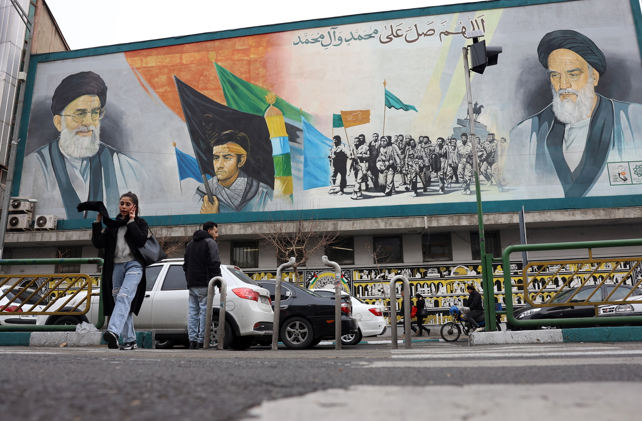| 19일(현지시간) 테헤란의 한 거리에서 한 여성이 이란 최고 지도자 아야톨라 알리 하메네이(왼쪽 위)와 이란 전 최고 지도자 아야톨라 루홀라 호메이니(오른쪽 위)의 벽화 앞을 지나가고 있다.[EPA] |