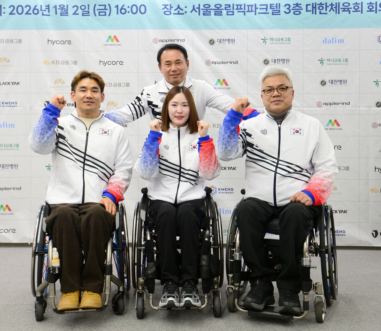 | 2026 밀라노-코르티나 동계패럴림픽대회 휠체어컬링 믹스더블 국가대표 이용석(왼쪽부터), 백혜진 선수와 박길우 감독. 뒤에는 대한장애인컬링협회 윤경선 회장 |