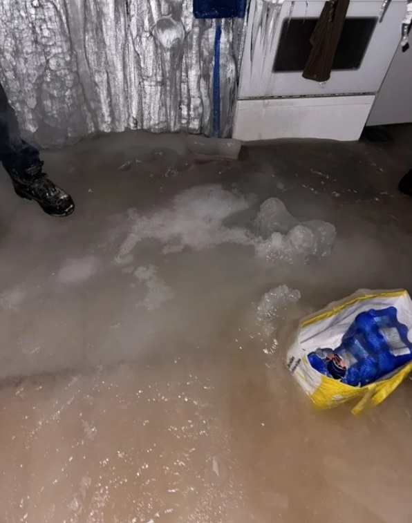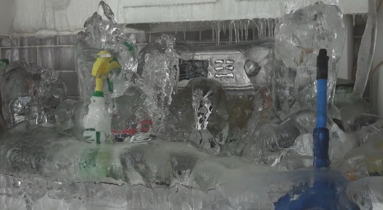 공개된 사진에는 벽과 천장, 가구, 전자제품까지 얼음으로 뒤덮인 모습이 담겼다. 천장에는 고드름이 달리고, 바닥에는 두께 약 30cm에 달하는 얼음층이 형성됐다.