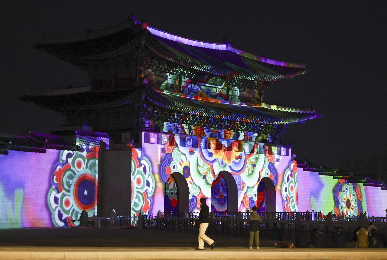 | 서울윈터페스타 통합 개막식이 열린 지난달 12일 경복궁 광화문에서 미디어파사드가 진행되고 있다. [연합] |