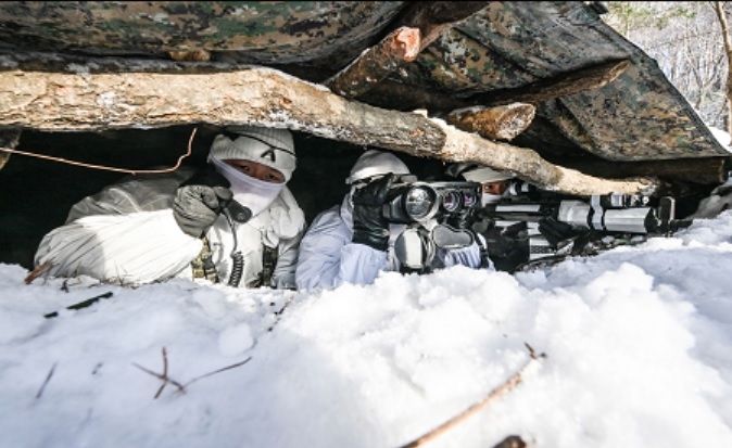 | 육군 특전사는 부대별 11박 12일 일정으로 강원도 대관령 황병산 일대 동계훈련장에서 설한지 극복훈련을 실시하고 있다. 사진은 육군 특전사 장병들이 설한지 극복훈련 간 다기능 관측경으로 핵심표적의 움직임을 관측하고, 항공화력을 유도하는 모습.[육군] |