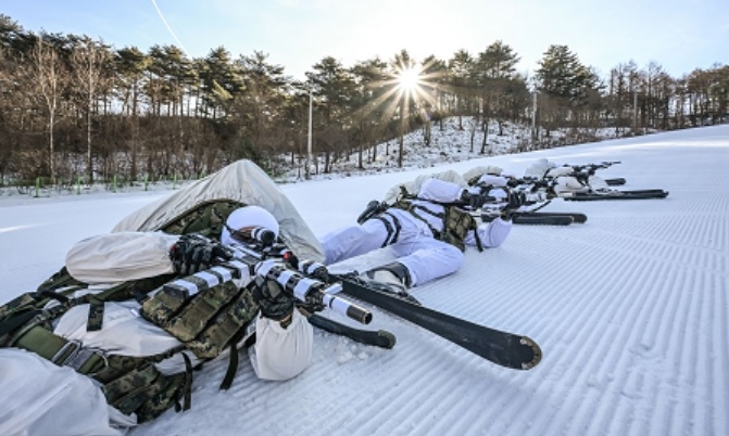 | 육군 특전사는 부대별 11박 12일 일정으로 강원도 대관령 황병산 일대 동계훈련장에서 설한지 극복훈련을 실시하고 있다. 사진은 육군 특전사 장병들이 설한지 극복훈련 간 스키를 활용한 설상 기동훈련(전술스키) 중 적과 조우한 상황에서 사격 자세를 취하고 있는 모습. [연합] |