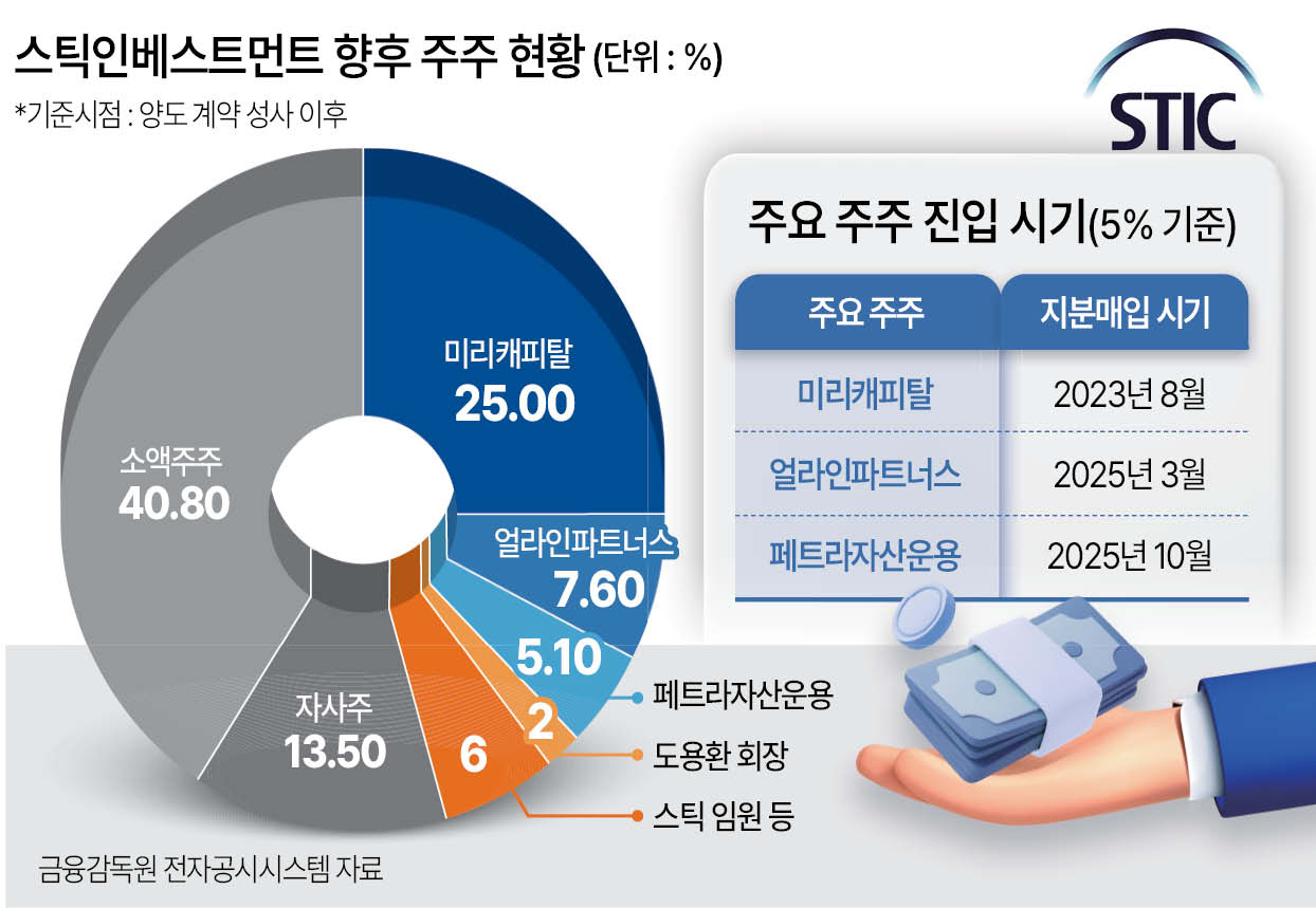 이번 매각으로 미리캐피탈은 기존 보유 지분 13.52%에 더해 약 25%의 지분을 확보하며 스틱의 단일 최대주주로 올라서게 된다. 미리캐피탈은 경영 컨설팅과 행동주의를 결합한 전략을 구사해 온 미국계 헤지펀드로, 스틱의 2대 주주로서 비교적 우호적인 관계를 유지해왔다는 평가다.