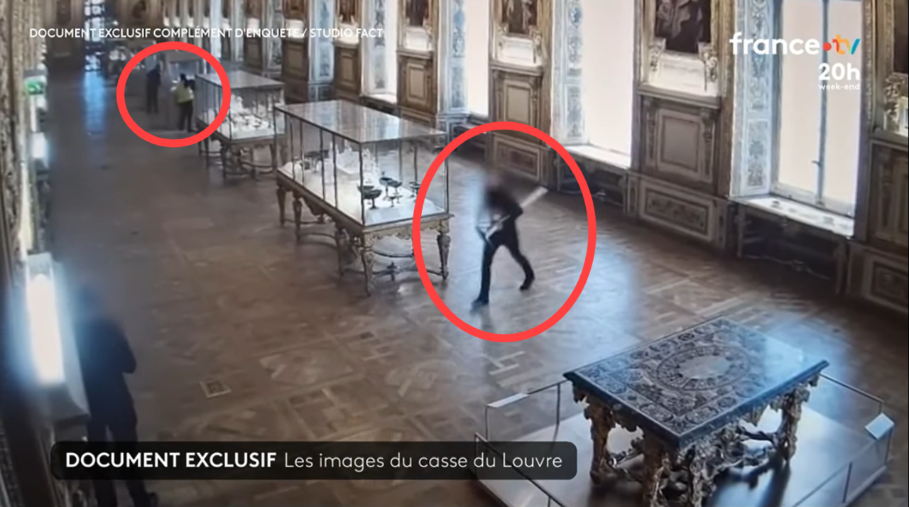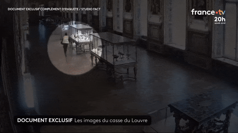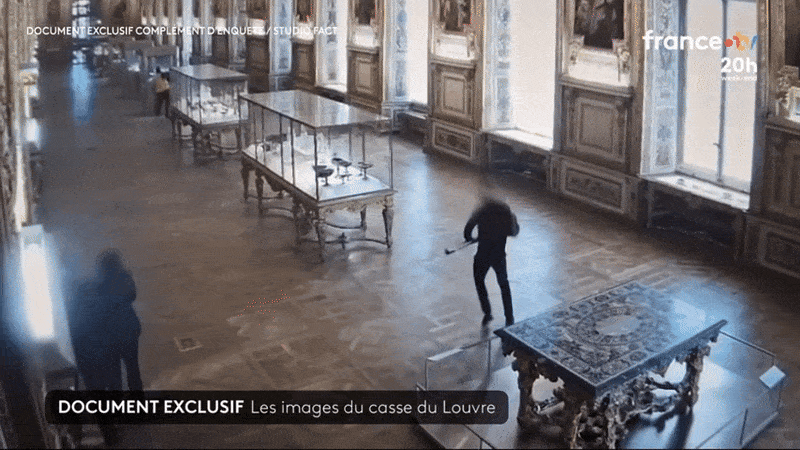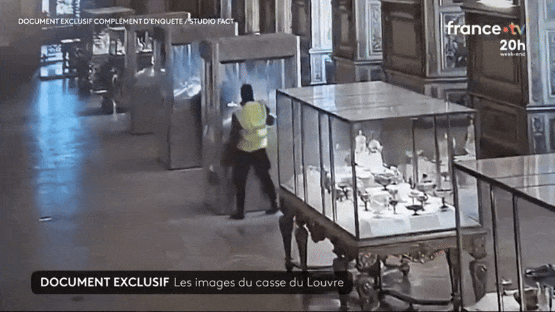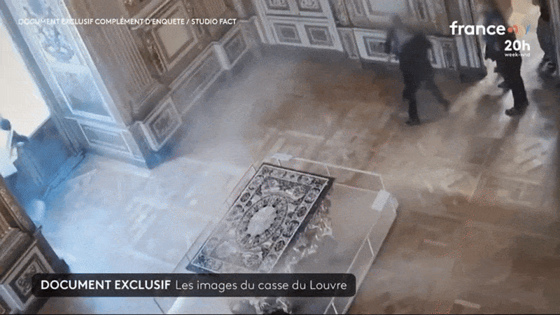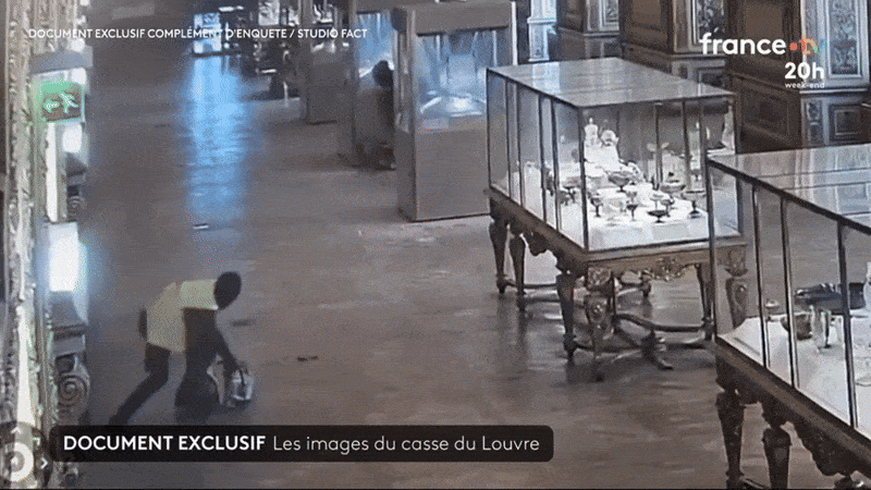 프랑스 TF1 방송 등이 최근 공개한 박물관 내부 CCTV 영상에 따르면 형광 조끼에 두건으로 얼굴을 가린 첫번째 절도범이 10월 19일 오전 9시34분 창문을 부수고 왕실 보석 전시실인 아폴론 갤러리 안으로 침입했다.