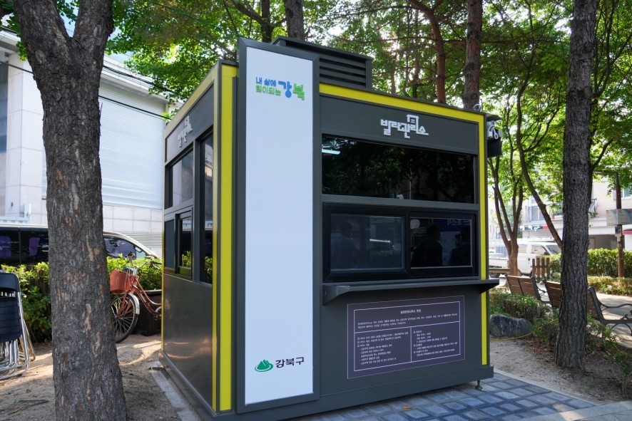 | 나무 옆에 설치된 강북구 빌라관리사무소 부스의 전경을 담은 사진이다. 부스에는 ‘강북구’ 텍스트와 함께 운영 시간, 위치, 연락처 정보가 적혀 있다. |
