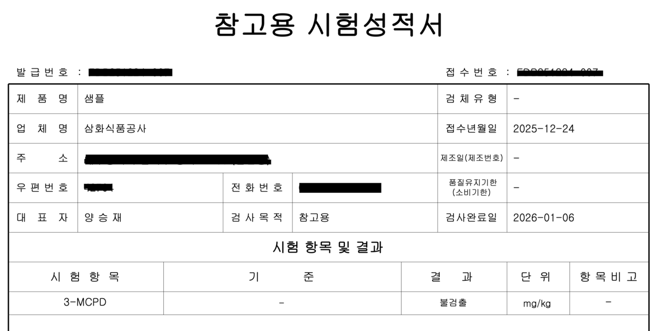 | 삼화식품공사가 ㈜동진생명연구원에 자체 의뢰한 간장 3-MCPD 시험 성적서에 ‘불검출’이 명시돼 있다. [삼화식품공사 제공] |